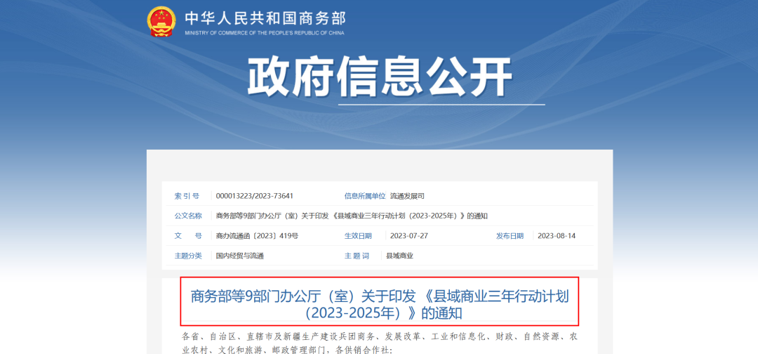 2023年8月14日,商務部等9部門辦公廳(室)發布關于印發 《縣域商業三年行動計劃(2023-2025年)》的通知?!队媱潯窂娬{,繼續支持新能源汽車下鄉,進一步加快農村充換電設施建設,完善服務網絡,著力推動新能源汽車下鄉,新能源車下鄉市場將迎來爆發增長。