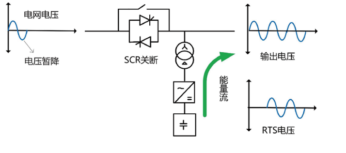在電網發生電壓暫降/暫升時,AVC-RTS快速控制晶閘管斷開,電網電壓完全與負載隔斷。與此同時系統由超級電容通過逆變器放電,全力向負載輸出預先設定的標稱電壓,保證負載輸出電壓穩定在100%。