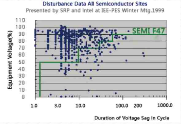 下圖是美國電科院EPRI對電壓暫降的調查情況,經過兩次在全美洲22站點進行電能質量研究共記錄到1076個電壓暫降事件,其中在綠色線(SEMI)標準上方的電壓暫降的數量占總數的93%僅有6個事件為斷電,僅有3個事件在2秒以外。