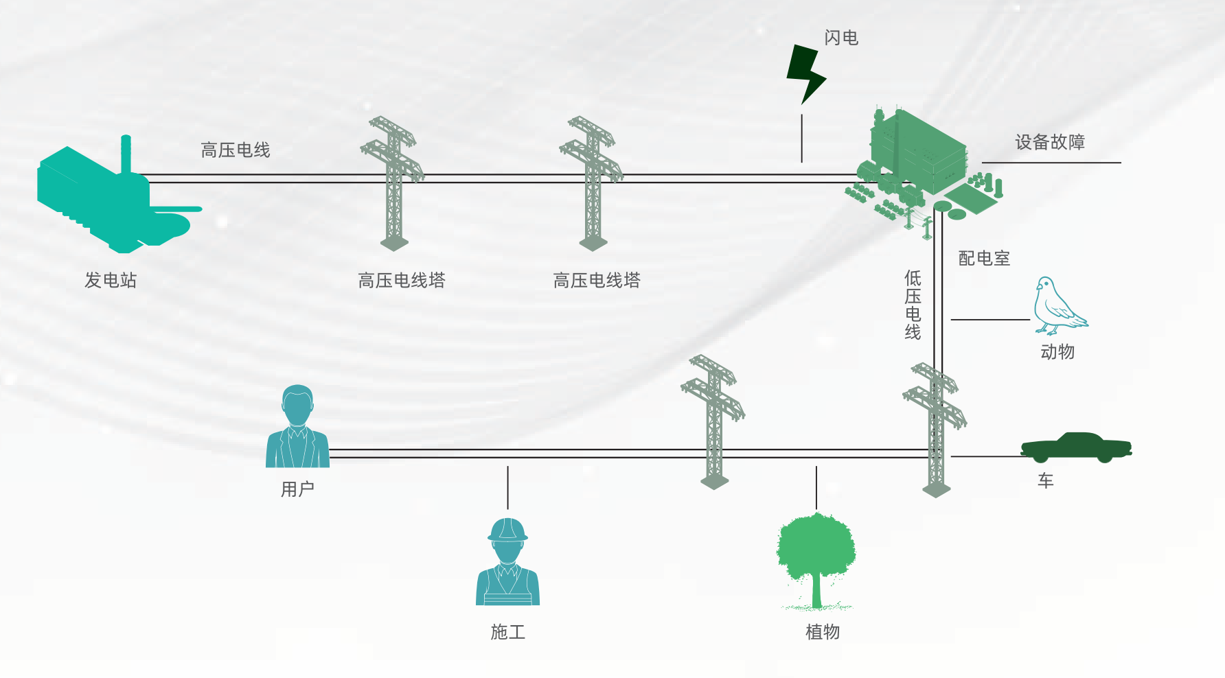 交通事故,建筑施工造成輸電線路損壞,人為操作失誤、小動物進入配電室等。