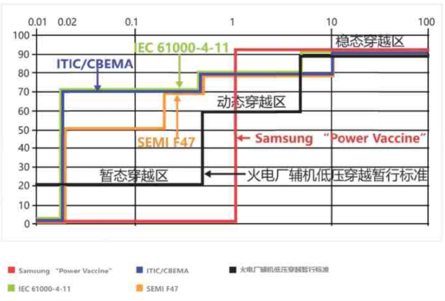 下圖是各類標準對電氣設備的免疫要求,從免疫曲線來看,一般設備對于短時間中度暫降以及長時間幅度較小的暫降事件具備很好的免疫力。但是不具備短時深度暫降免疫力,所以跌落幅度大的電壓暫降事件是帶來電壓暫降危害的主要原因。